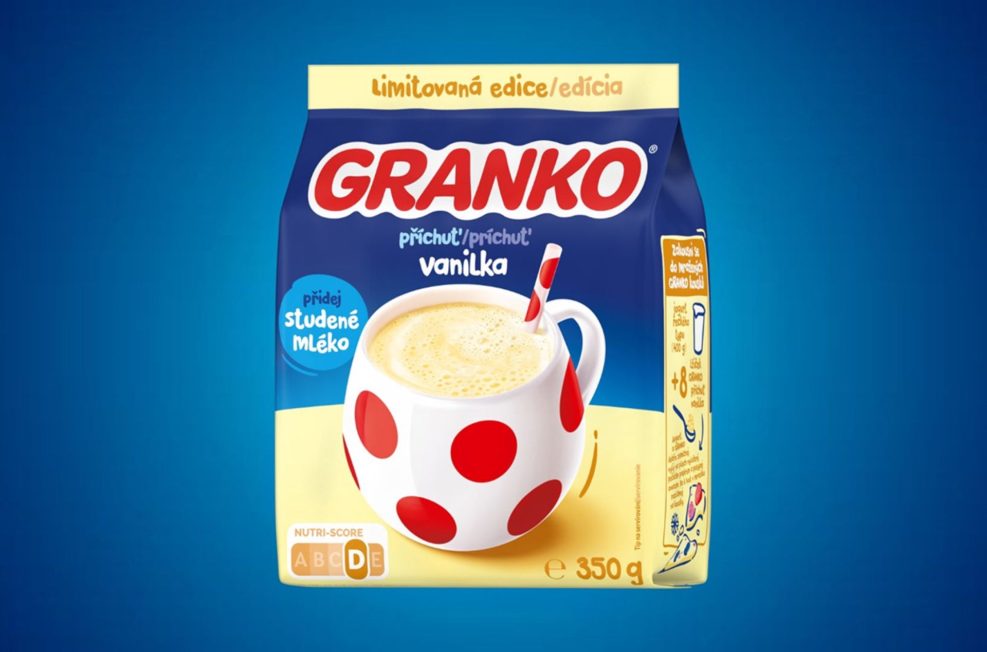 Osviežte sa mliečnym kokteilom GRANKO s vanilkovou príchuťou. Jednoducho zamiešajte sypkú zmes do studeného mlieka a vychutnajte si rýchlu desiatu, ktorá ochladí aj zachutí.
